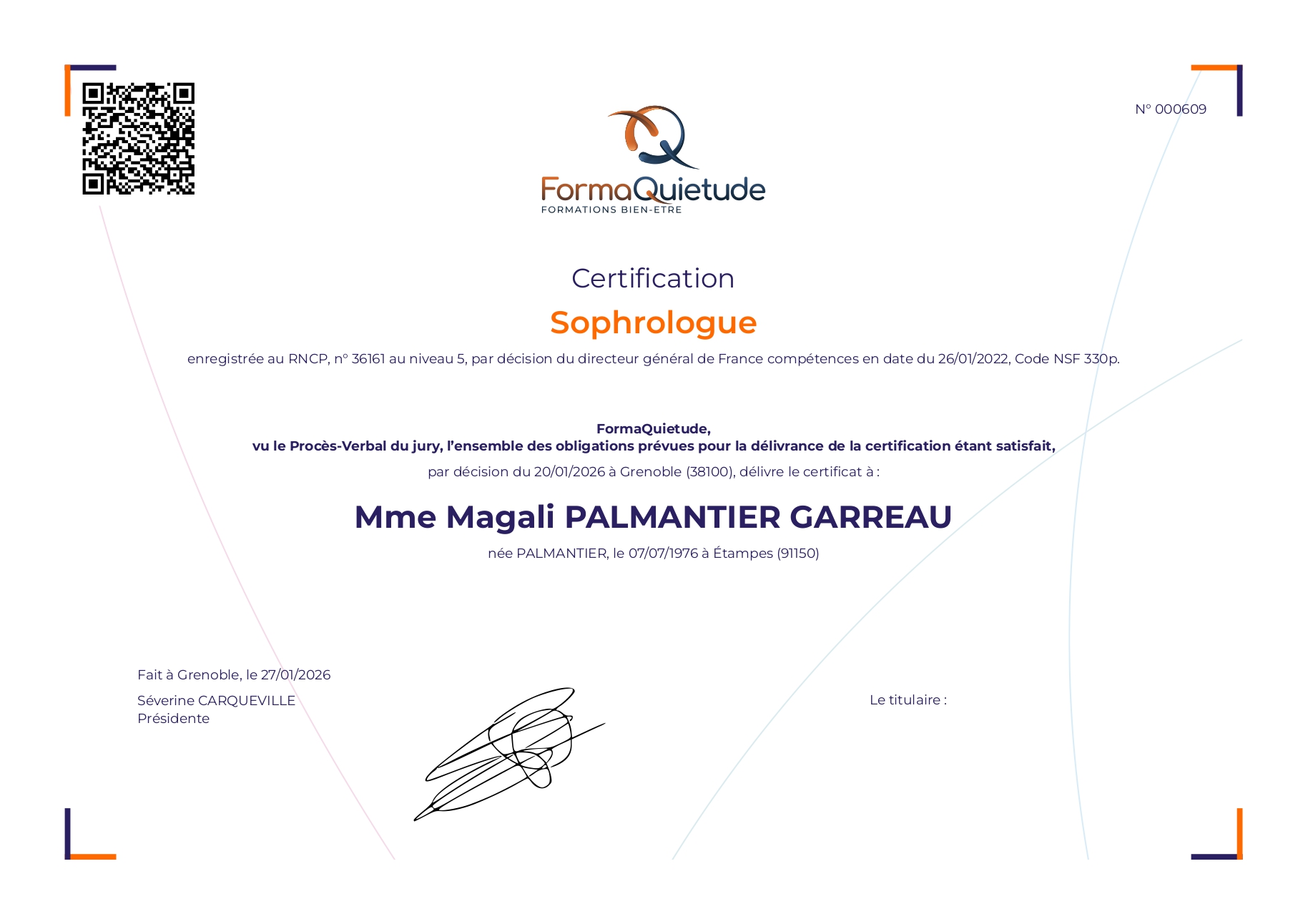 Je me suis formée en cursus long auprès de FormaQiétude à Grenoble, centre reconnu pour son exigence pédagogique. Durant ma formation j’ai validé avec succès les 3 blocs de compétences exigés.